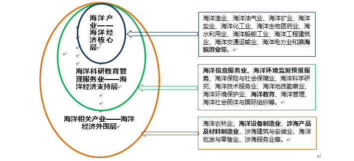 根据中国国家海洋局海洋经济统计公报,海洋产业是开发、利用和保护海洋所进行的生产和服务活动。根据海洋经济活动的性质,海洋经济划分为两类三个层次,海洋产业又分为海洋产业和海洋科研教育管理服务业。