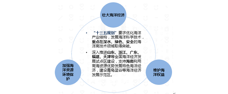 当前中国经济已发展成为高度依赖海洋的外向型经济,海洋经济成为拉动中国国民经济发展的有力引擎。2015年,我国海洋产业总体保持稳步增长,海洋油气业、海洋渔业以及海洋矿业GDP总值及占比连年增长,未来5-10年是我国海洋工程装备制造业和海洋经济发展的关键时期,一旦打开新应用领域,市场空间巨大。2020年海洋生产总值占GDP比重将超过12%,到2030年这一比重将超过15%。而中共十八大首度将建设海洋强国提升至国家发展战略高度,“十三五规划”再次明确拓展蓝色经济空间,建设海洋强国,深入推进海洋区域经济发展。