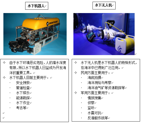水下机器人和水下无人机种类繁多,按照使用方式可以分为载人潜水器、自治水下机器人、有缆遥控机器人。在军用和民用领域都有广泛的应用,未来将会发挥更重要的作用,未来5-10年,水下机器人、无人机的需求会日益旺盛,产业规模将达千亿级,从军用到民用,从浅海到深海是水下机器人未来发展方向。